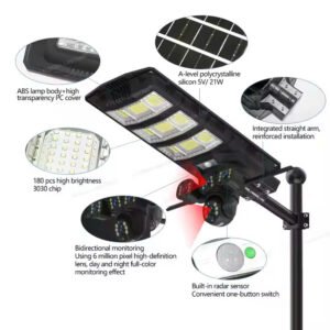 Có Khả năng chính của camera là ghi lại hình ảnh, video và thu thập dữ liệu để truyền qua internet. Bạn cũng có thể xem video trực tiếp từ bất kỳ đâu trên máy tính hoặc tất cả các dòng điện thoại di động. Sự kết hợp giữa đèn sáng và camera đánh dấu một bước tiến mới trong hệ thống đèn sáng đường điện năng lượng mặt trời, mang lại tính tiện ích và hiệu suất tối đa cho người dùng.