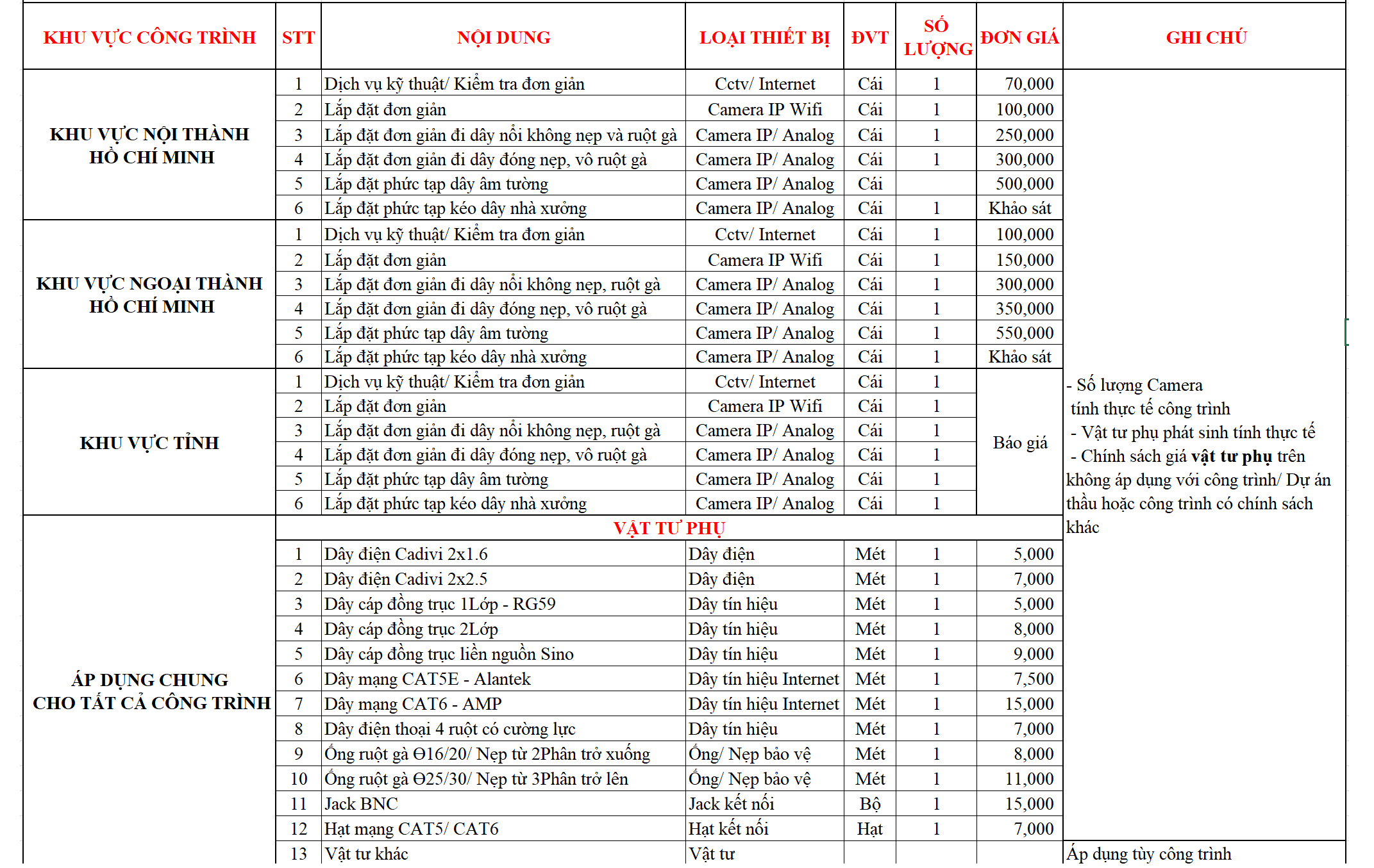 1/ Báo giá thiết bị/ Combo/ Bộ camera khuyến mãi chưa bao gồm nhân công