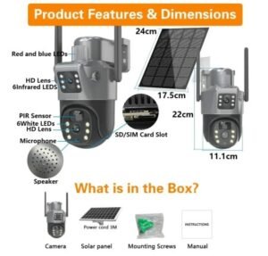 Các tính năng: Ống kính kép,,,, xem màn hình kép dễ dàng quan sát ở 2 vị trí khác nhau Tích hợp pin 12000 mA,,,, nếu trời âm.u không có nắng vẫn có thể quan sát 2-3 ngày. Camera giám sát năng lượng mặt trời ngoài trời 8.0 megapixel