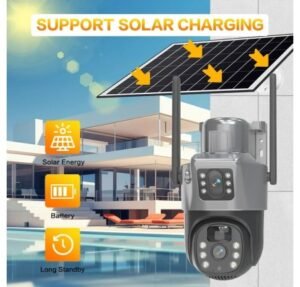 Camera PTZ ngoài trời 2 mắt chống nước sử dụng bằng sim 4G Camera ip wifi và tấm bảng năng lượng mặt trời,,,, quý khách không cần lo lắng khi lắp ở những nơi không có điện lưới và không có mạng internet như ngoài vườn,,,, trong rừng,,,, cánh đồng,,,, công trường… để dễ dàng quản lý…