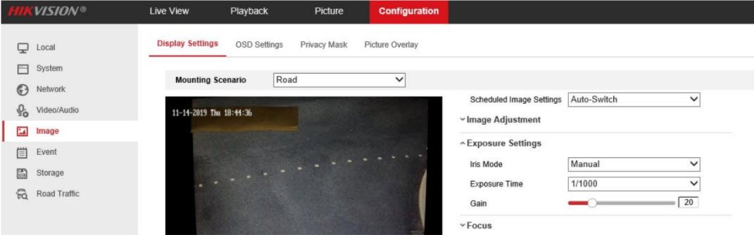 - Đặt chế độ hiển thị là Road. Ở chế độ này, Exposure Time là 1/1000, Gain là 20 theo mặc định. Chỉnh cấu hình tùy theo hình ảnh chụp được. Giảm Exposure Time sẽ giảm cháy sáng do đèn xe gây ra. Tăng Gain sẽ giúp hình biển số sáng hơn.