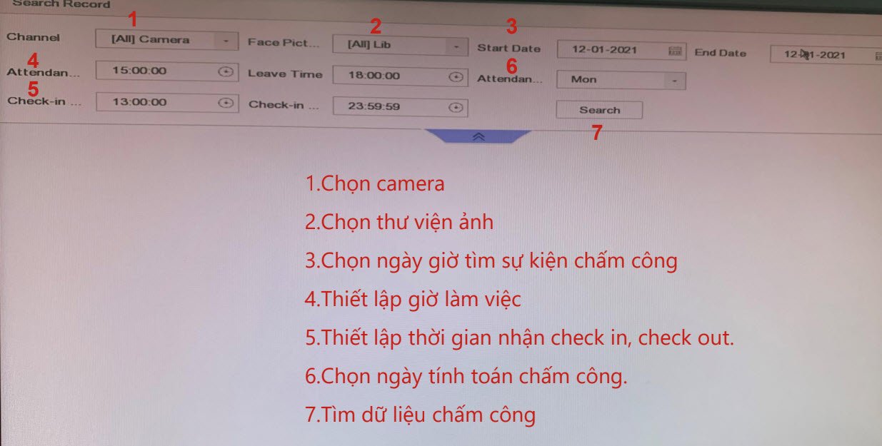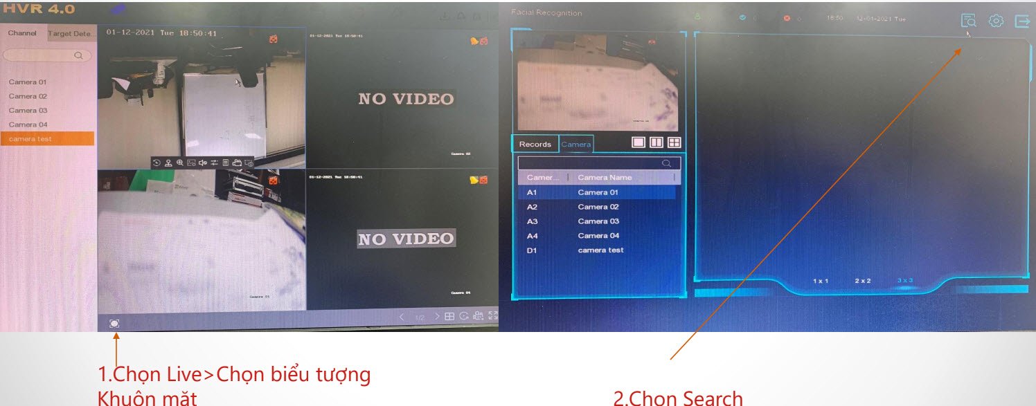 -Chọn Liveview>Chọn biểu tượng khuôn mặt>Chọn Search Record