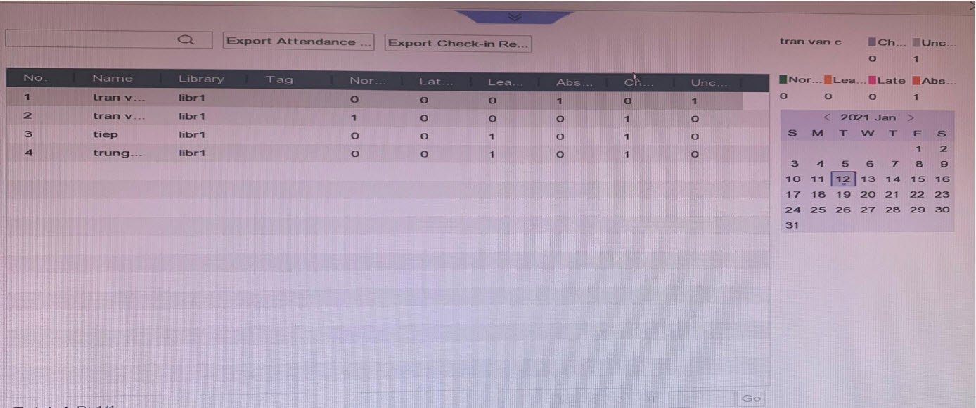- Chọn Search (7) sẽ cho ra dữ liệu chấm công của những người trong thư viện đã chọn.