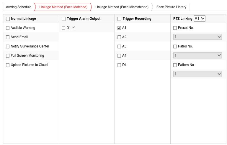 - Linkage Method (Face Matched): những hành động liên kết sẽ thực hiện khi khuôn mặt được phát hiện trùng khớp với những khuôn mặt trong CSDL.