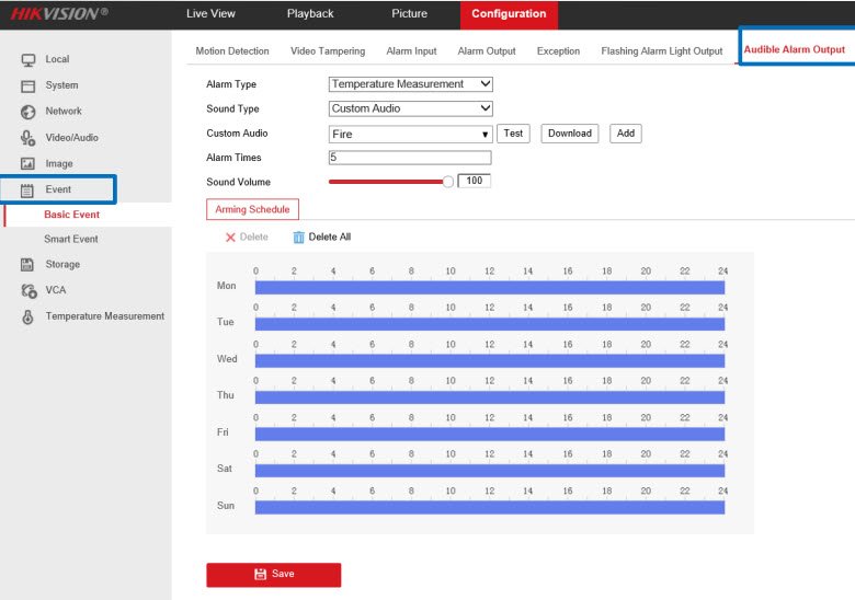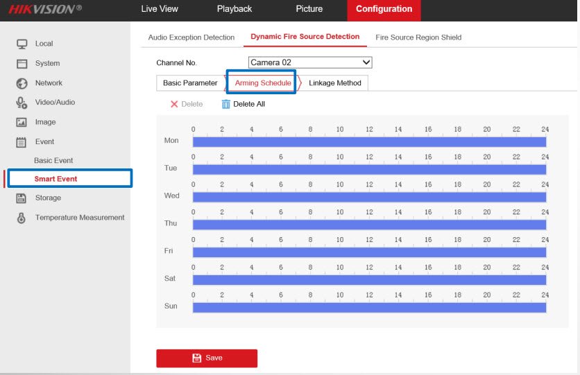 - Mục Configuration→ Event → Smart Event→ Dynamic Fire Source Detection → Arming Schedule