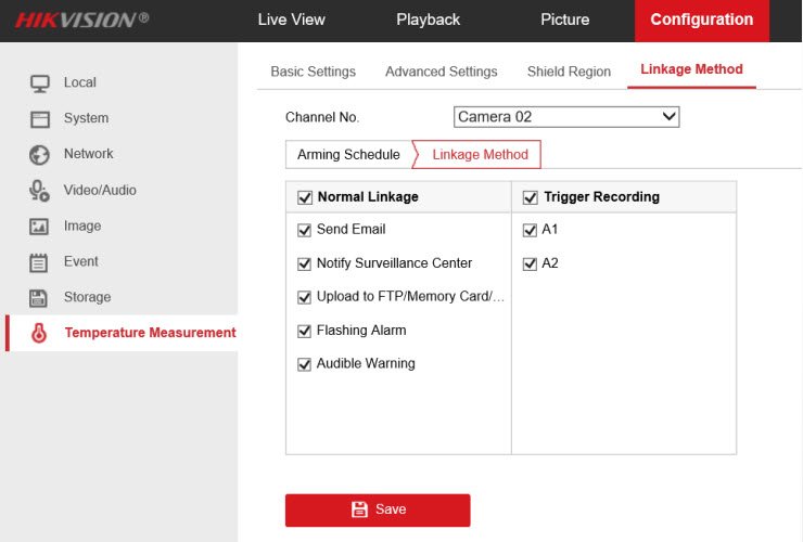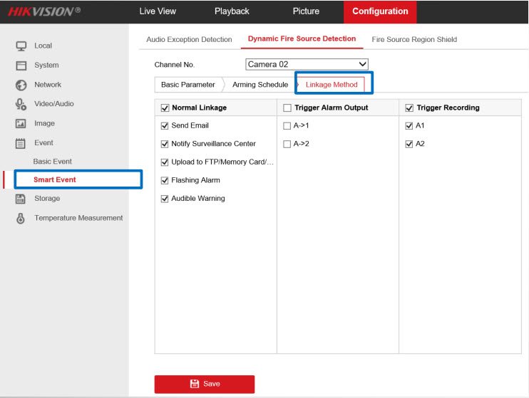 - Mục Configuration→ Event → Smart Event→ Dynamic Fire Source Detection → Linkage Method