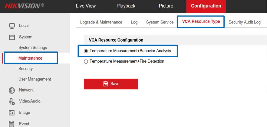 - Mục Configuration→ System → Maintenance→ VCA Resource Type