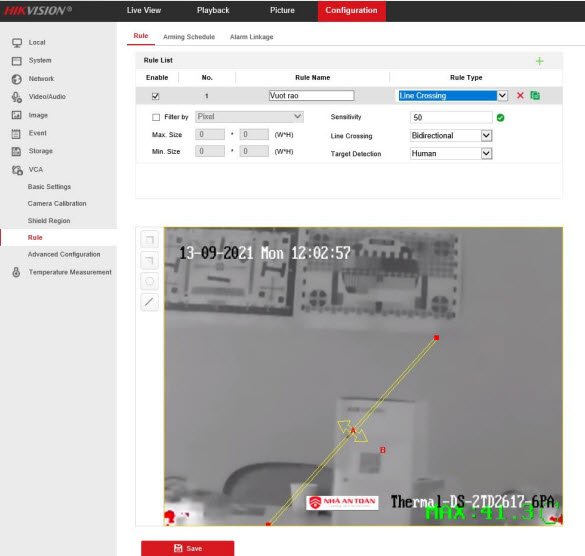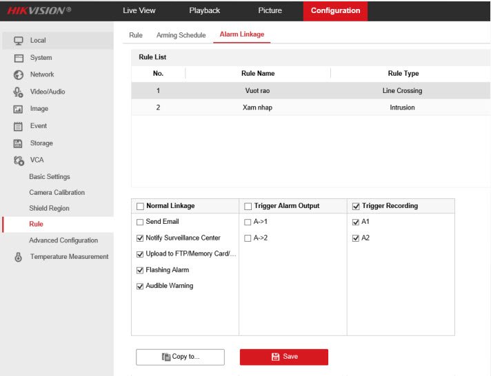 Mục Configuration→ VCA → Rule → Alarm linkage→ Chọn VCA rồi chọn liên kết