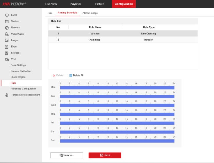 - Mục Configuration→ VCA → Rule → Arming Schedule → Chọn VCA rồi đặt lịch