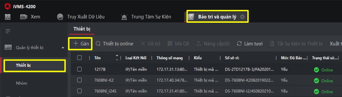 - Chọn bảo trì quản lý → Quản lý thiết bị → Gán Camera và NVR vào phần mềm