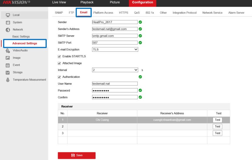 - Mục Configuration→ Network → Advanced Settings → Email