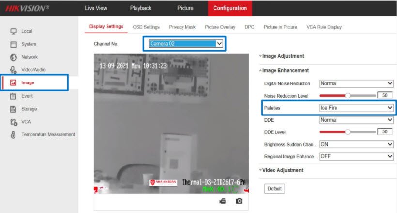 - Mục Configuration→ Image→ Display Settings → Chọn Camera 02 (ảnh nhiệt)