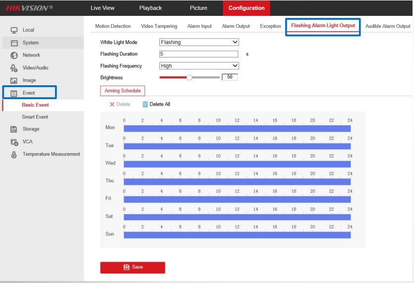 Mục Configuration→ Event→ Basic Event→ Flashing Alarm Light Output