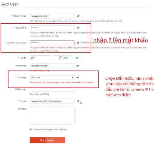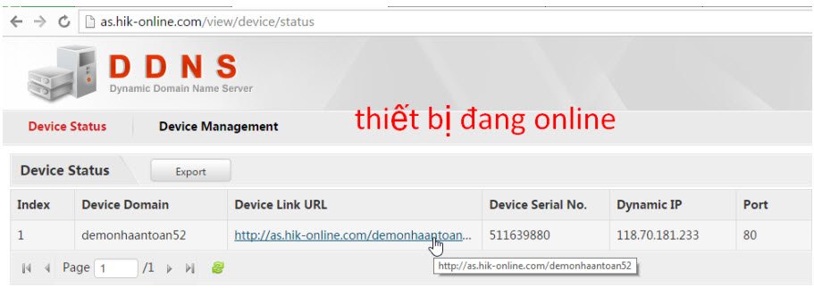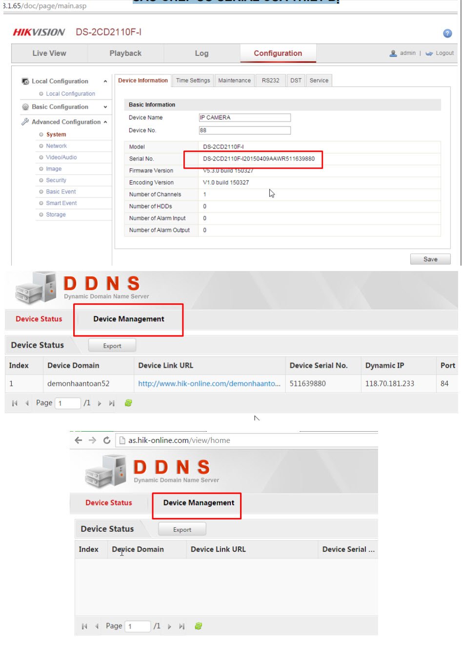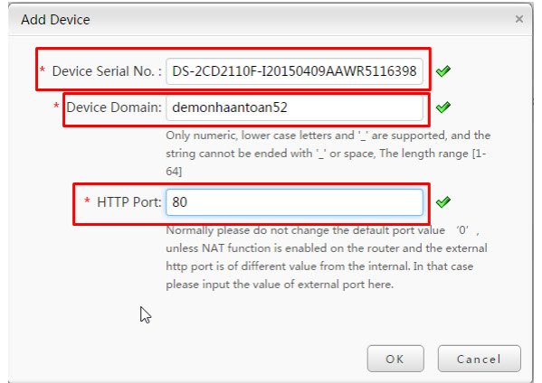 - Nhập số serial, tên Domain và Port của thiết bị vào tài khoản: