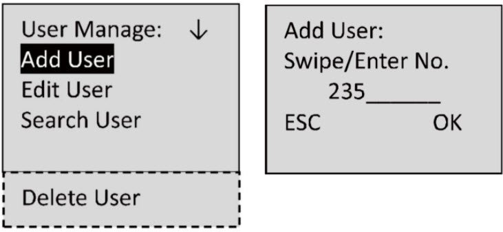 - Tại Menu chính, chọn User Manage để vào Menu quản lý người dùng. Chọn mục Add User để thêm người dùng sau đó quẹt thẻ hoặc nhập số card cho người dùng và nhấn [#] để xác nhận.