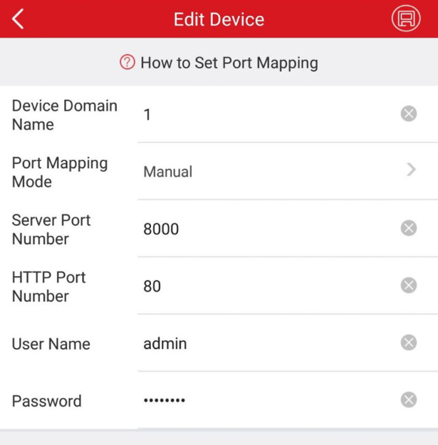 - Bạn nhấn vào mục Configure DDNS (cấu hình DDNS) để truy cập giao diện cài đặt thông tin camera. Sau đó, cài đặt các thông số theo hướng dẫn sau: Port Mapping Mode → Manual → Server Port Number mặc định là 8000 → HTTP port Number (Cổng HTTP được mặc định là 80) → User Name (tên người dùng) → Password (mật khẩu).