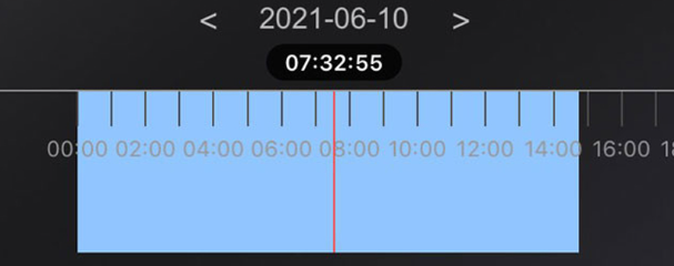 - Sau khi bạn nhấn Phát lại, video trên máy sẽ hiện ra hình ảnh từ lúc 00:00:00 của ngày gần nhất. Đi kèm với đó là thanh màu xanh hiển thị dữ liệu lưu trữ của camera và thời gian ghi hình. Bạn có thể kéo các thanh màu xanh này tới thước đo vạch màu đỏ để chọn thời gian cần xem.