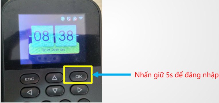 • Nhấn nút OK khoản 5s → nhập mật khẩu để đăng nhập vào máy chấm công Có thể cài vân tay cho admin để đăng nhập bằng vân tay cũng được
